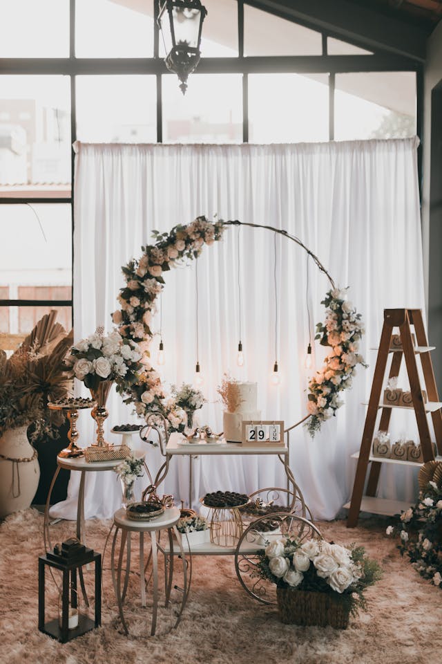 Fabric draping is not the only thing you can hang from a round arch. Hanging bulbs, fairy lights, string lights, or hanging votives can all add a bit of glow and sparkle to an otherwise static display. Strings of pearls or lace ribbons can add movement and texture. Cut flowers strung on clear thread can create a magical floating effect, and draping vines of greenery can add a bit of whimsy. Finally, hanging polaroids of your favorite memories is a great way to make your decor more personal.