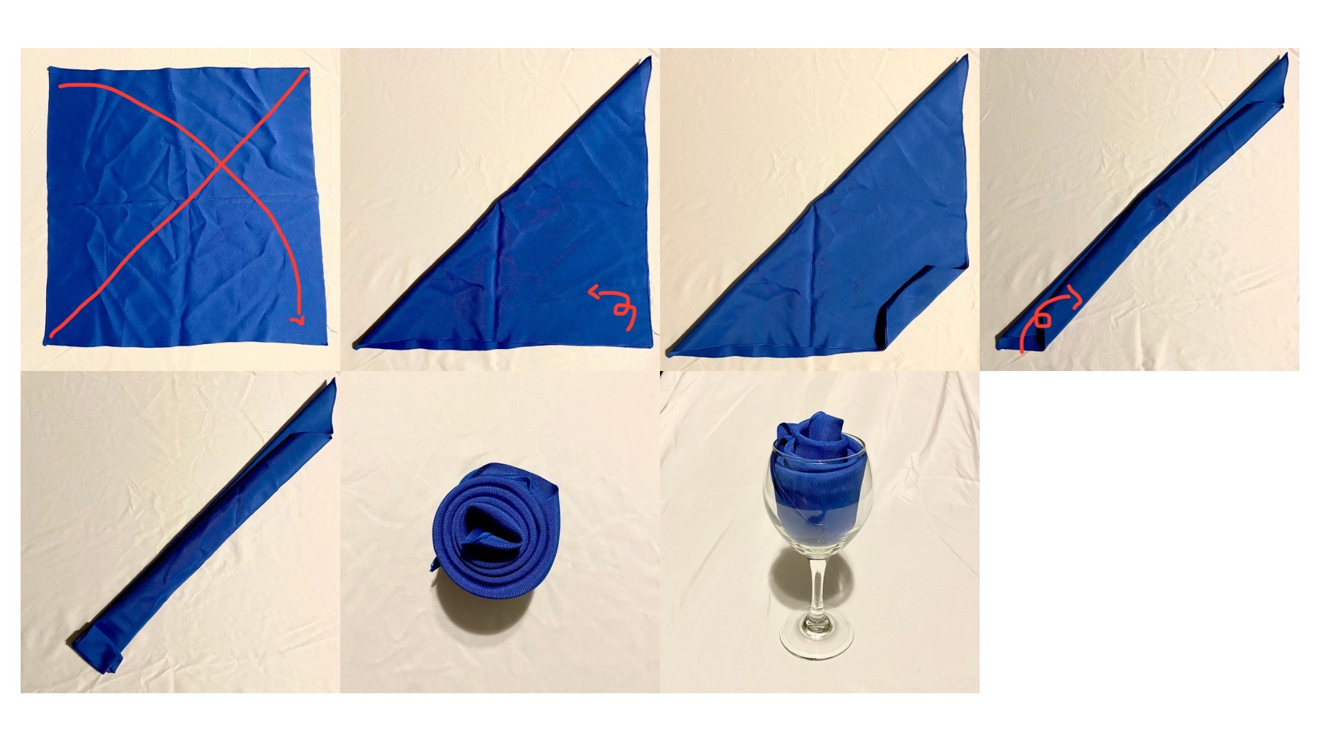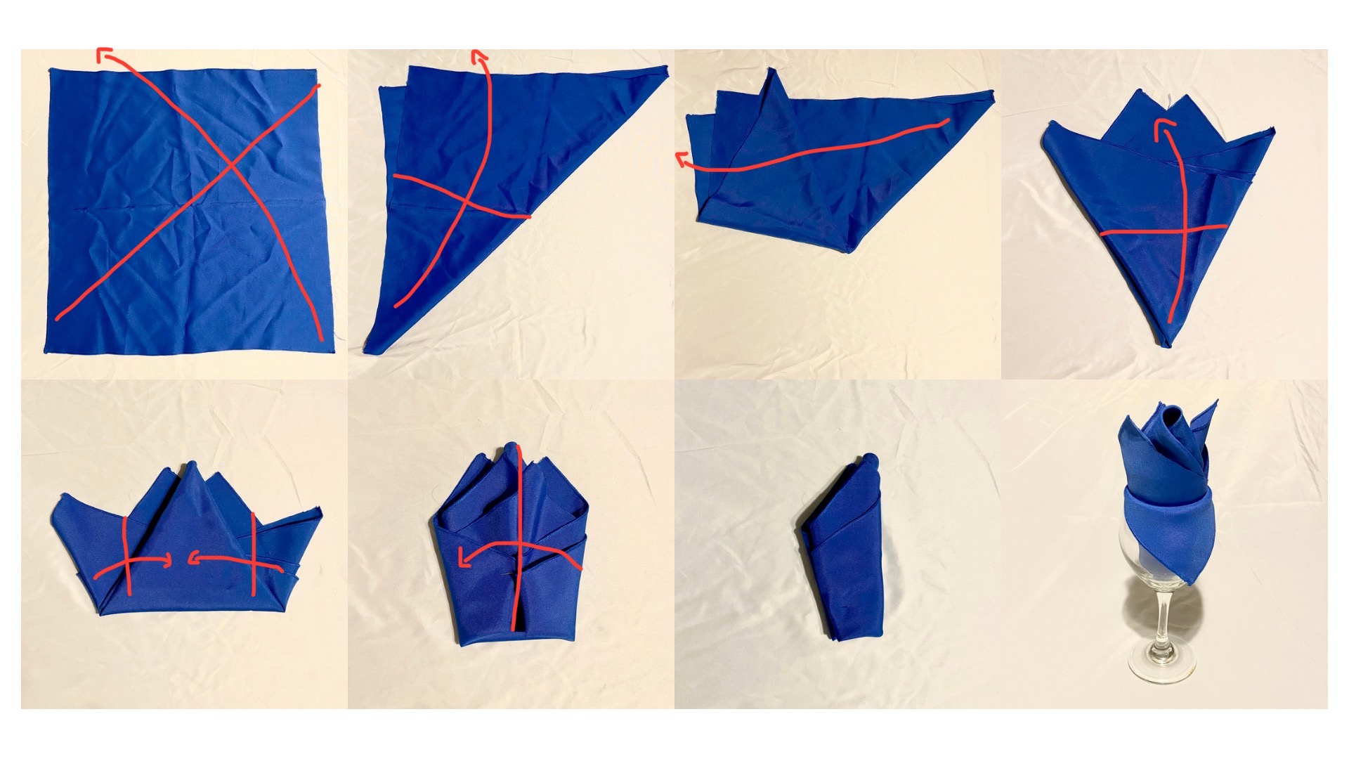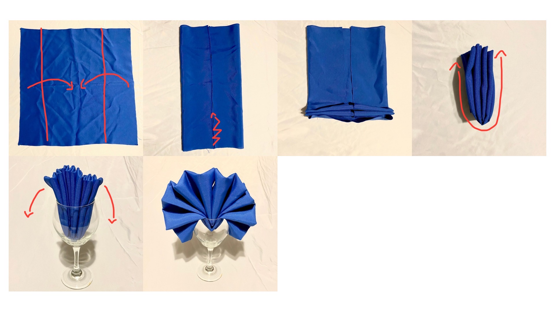 There are hundreds of ways to fold a napkin for a formal event and several positions on a banquet table those folded napkins can occupy. We already covered 8 napkin folds that look great on a plate or a tabletop (check them out here), but another popular option is to place folded napkins in an empty glass to add height and elegance to a table setting without taking up any additional space. Below are 7 napkin folds that look intricate and stunning in a glass but are incredibly simple to create.