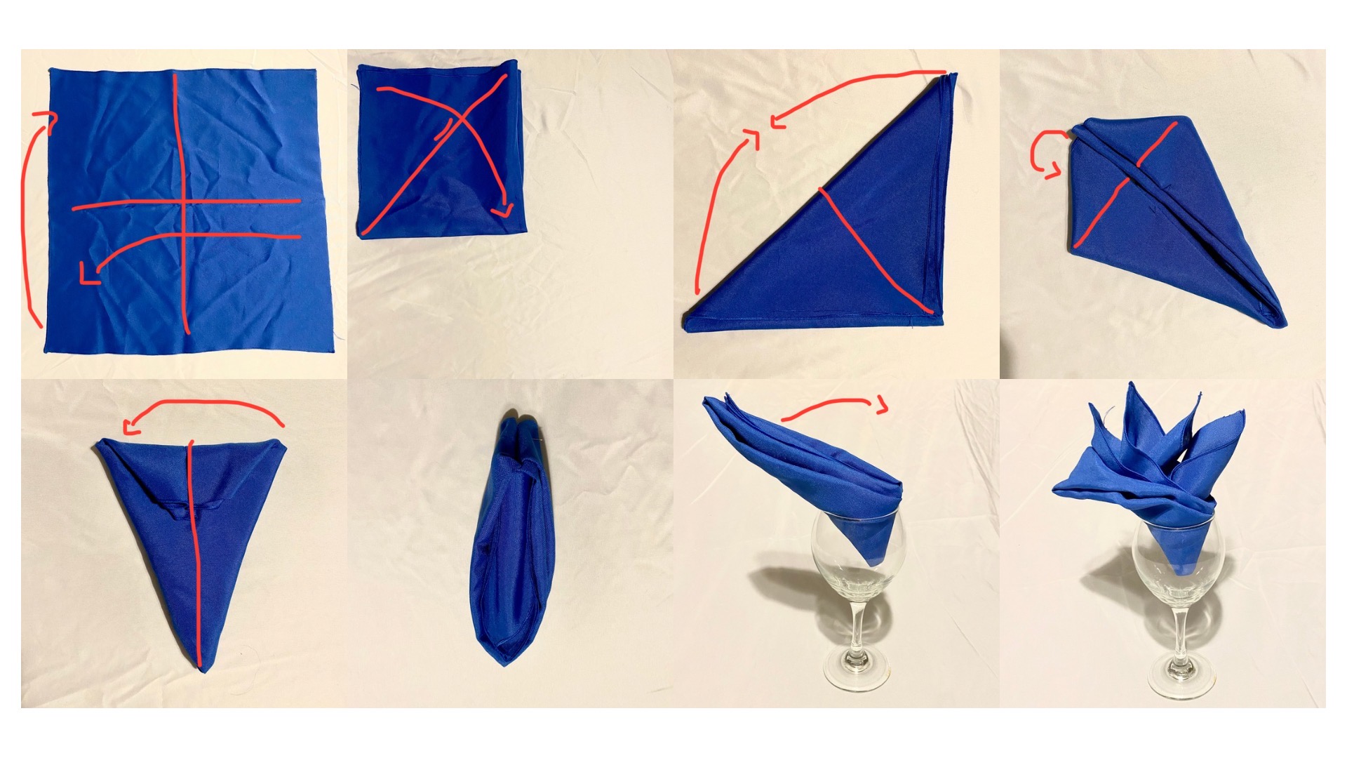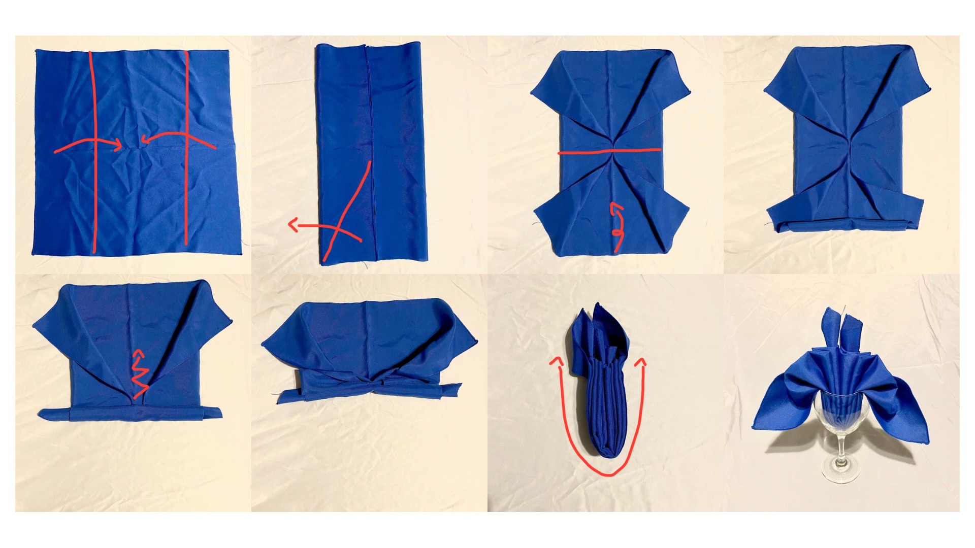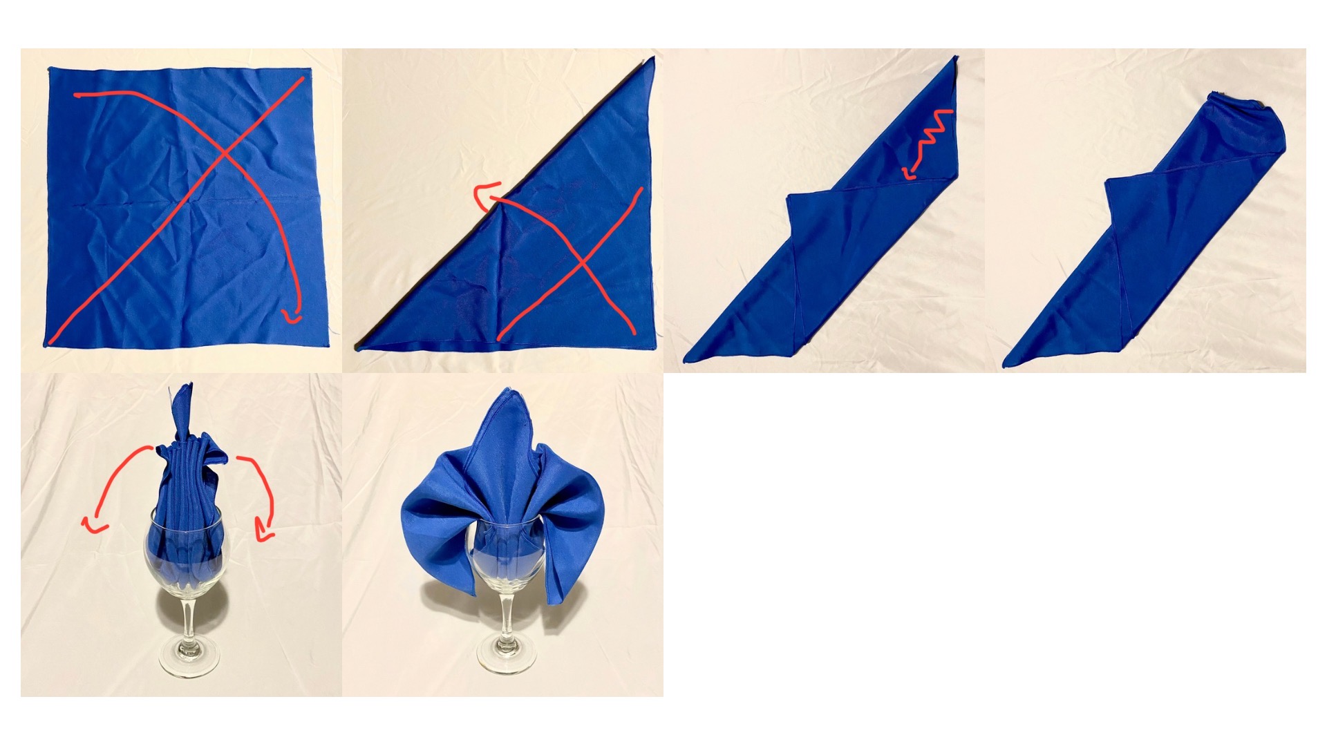 There are hundreds of ways to fold a napkin for a formal event and several positions on a banquet table those folded napkins can occupy. We already covered 8 napkin folds that look great on a plate or a tabletop (check them out here), but another popular option is to place folded napkins in an empty glass to add height and elegance to a table setting without taking up any additional space. Below are 7 napkin folds that look intricate and stunning in a glass but are incredibly simple to create.