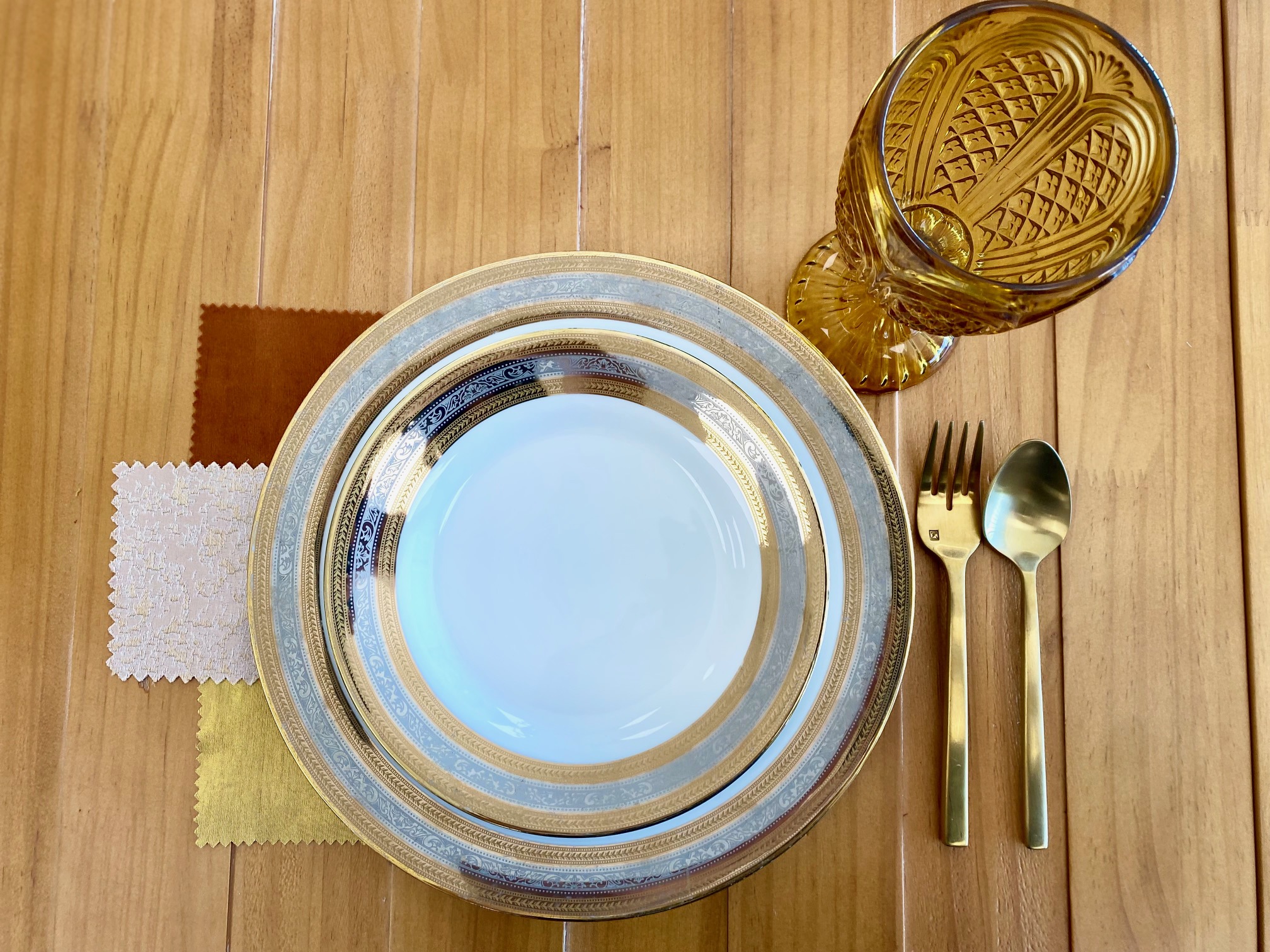 Those early evening October sunsets are the perfect reflection of the rustling trees and fallen leaves of the season. For this sunset inspired look, we chose a textured blush cloth with gold accents (BBJ Louvre Cameo) and paired it with a matching gold linen and a coordinating rust velvet. To compliment the luxurious feel of the linens, we chose our ornate majestic plates for tableware and paired them with gold arezzo flatware and amber carousel goblets. To complete this look, we suggest adding further gold accents using chargers, napkin rings, or name cards and choosing florals that bring out the blush and rust tones of the linens.