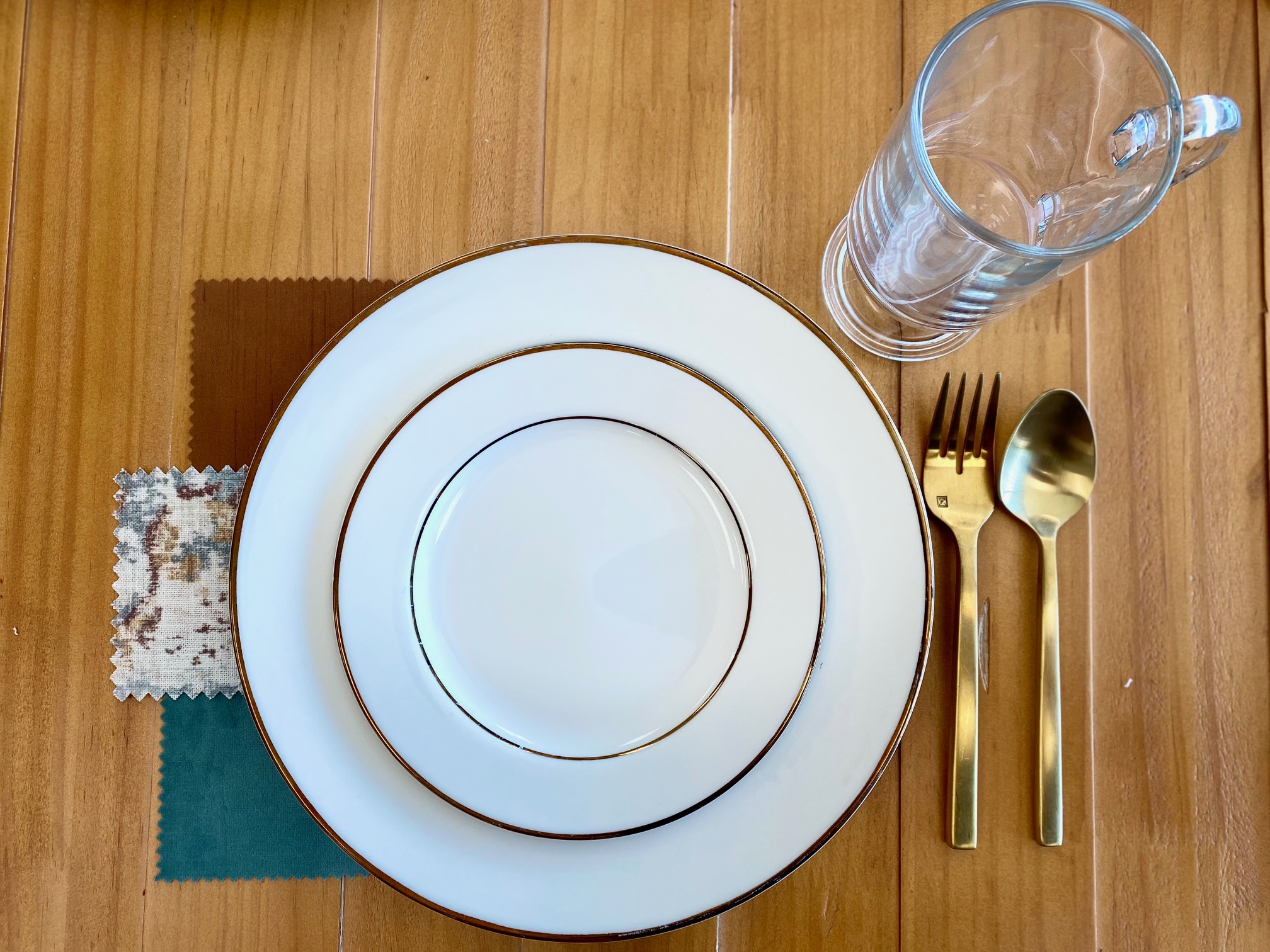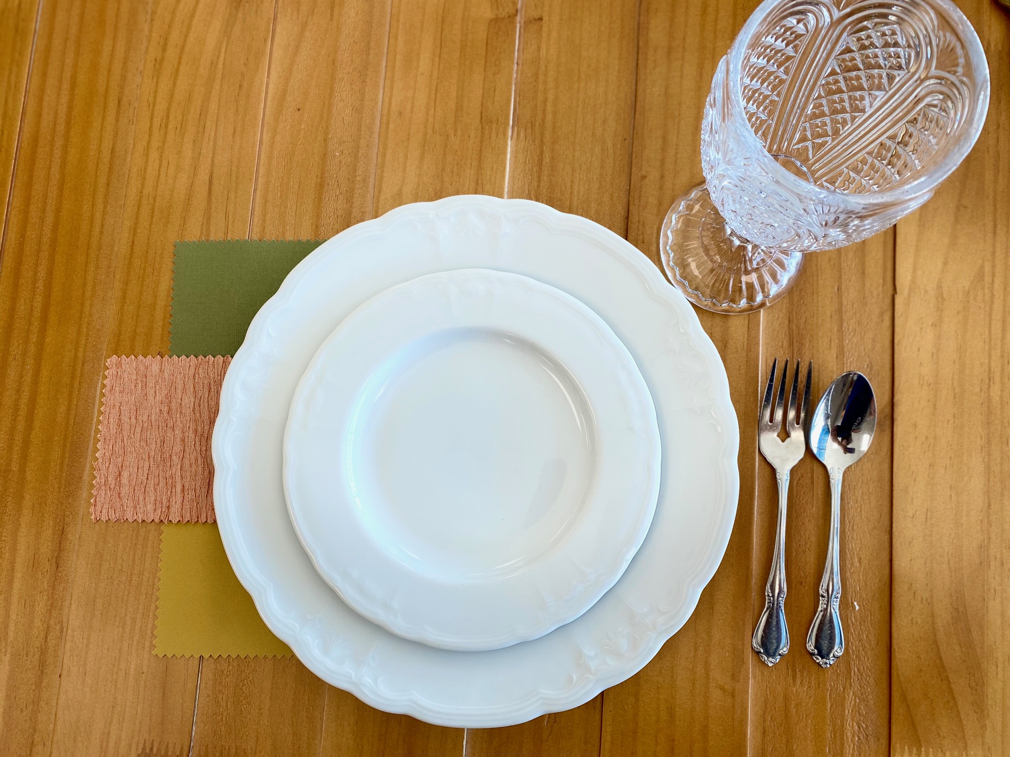 This look is inspired by our intrepid feathered migrators who spend the colder months along the southern coast. We chose a beautiful mallard velvet for our main cloth and chose to pair it with a complimentary saffron linen and gorgeous floral cloth that ties all the colors together (BBJ Fiore). For tableware, we chose a silver-banded white plate, silver arezzo flatware, and a stemmed crystal water glass. To style this look further, we suggest choosing wooden and silver accents, and we suggest opting for florals in varying shades of orange, red, gold, and teal.
