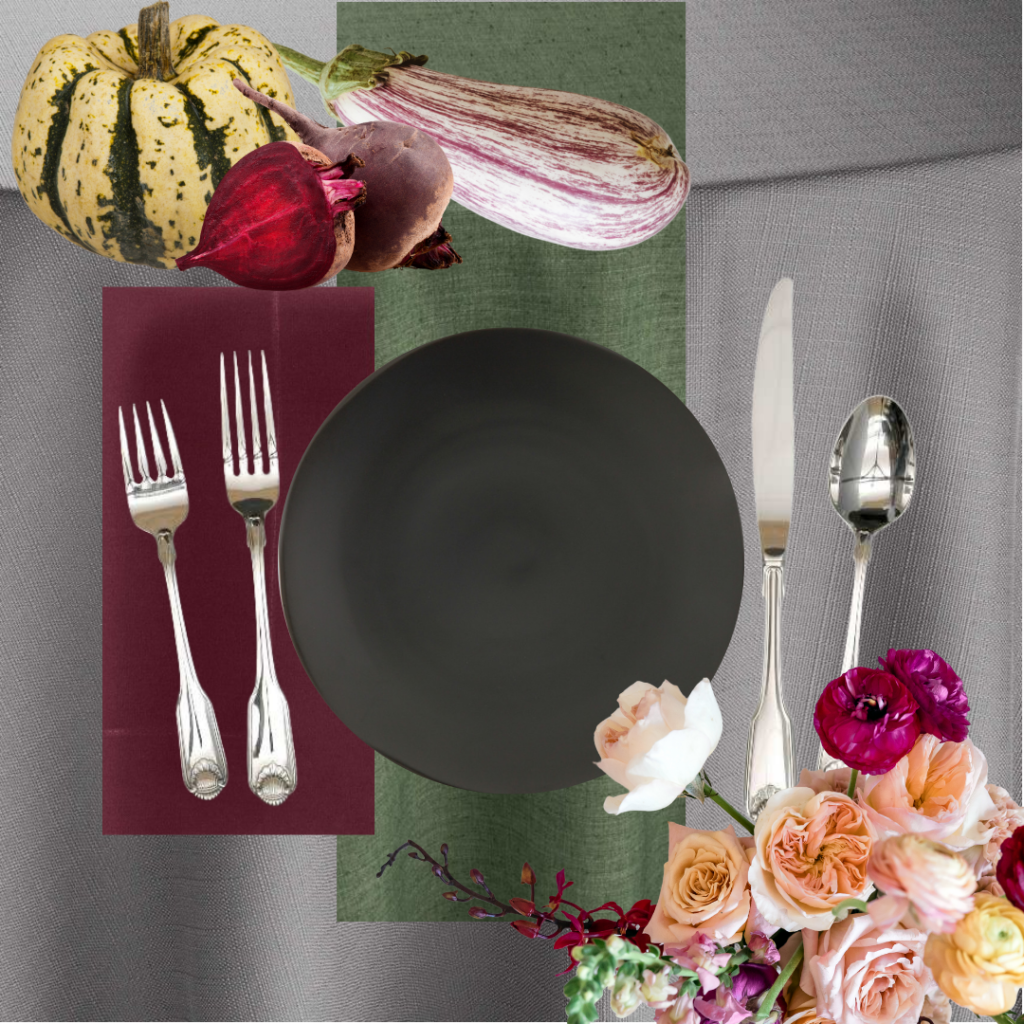 The cool-toned reds and greens in this look may look close to those Christmassy colors but balancing them with moody accessories brings us back to the land of elegance. We started this look with cool grey tablecloth with a gentle woven texture (BBJ Yuma Steel). We choose a variegated green runner (BBJ Verona Forest) to lay along the center, then set the table with our matte grey Heirloom Charcoal china and elegant silver Shell flatware. A napkin in dark, cool red (BBJ Nuovo Burgundy) adds another pop of color, and the look is finished with glossy florals in deep red, pale pink, and cream. To pair fresh produce with this look, choose items with moody colors, bold textures, and flashy patterns like beetroot, ornamental gourds, or graffiti eggplant.