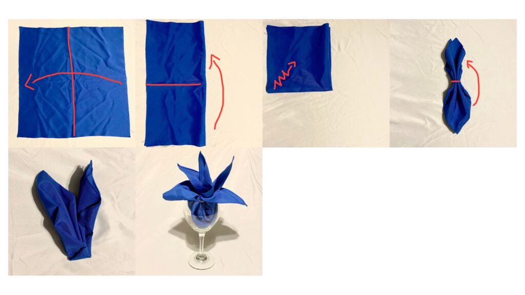 There are hundreds of ways to fold a napkin for a formal event and several positions on a banquet table those folded napkins can occupy. We already covered 8 napkin folds that look great on a plate or a tabletop (check them out here), but another popular option is to place folded napkins in an empty glass to add height and elegance to a table setting without taking up any additional space. Below are 7 napkin folds that look intricate and stunning in a glass but are incredibly simple to create.