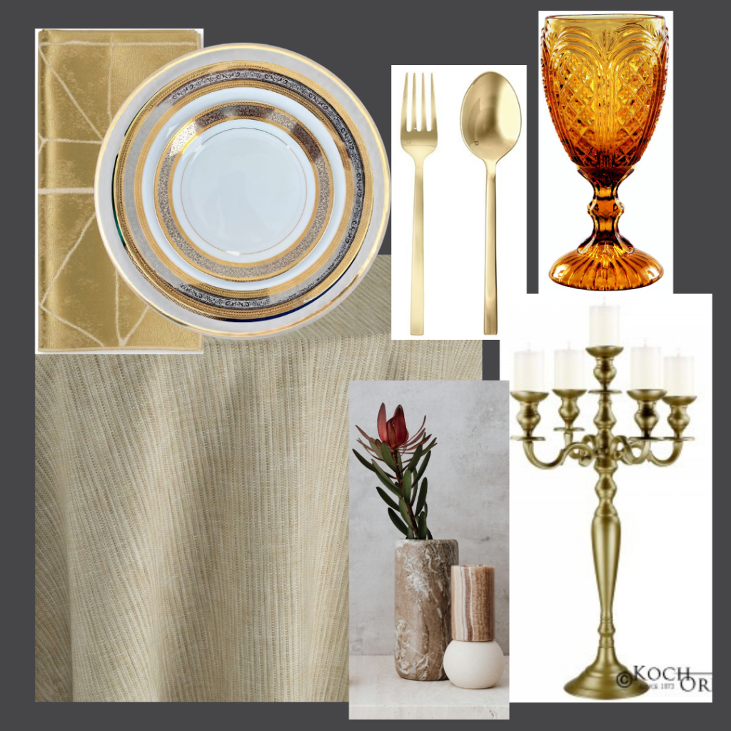 If you’ve seen The Mummy starring Brendan Fraser, then you know that mummies in western culture are often associated with treasure troves, ancient curses, and tales of warnings and revenge in this life and the life after. These are all themes that fit right in with Halloween. For this mummy inspired table we chose a natural beige linen with a subtle striped texture to mimic a mummy’s wrappings (BBJ Basketweave Natural). We thought that gold was the best and obvious choice for metallic accents, so we set the table with a gold-rimmed charger, majestic gold and silver filigree dinner plates, arezzo gold flatware, and an amber carousel goblet. We added further gold elements in a candelabra and a geometric golden napkin (BBJ Entangled Gold). For florals we chose a simple arrangement of rusty protea in an earthenware vase.