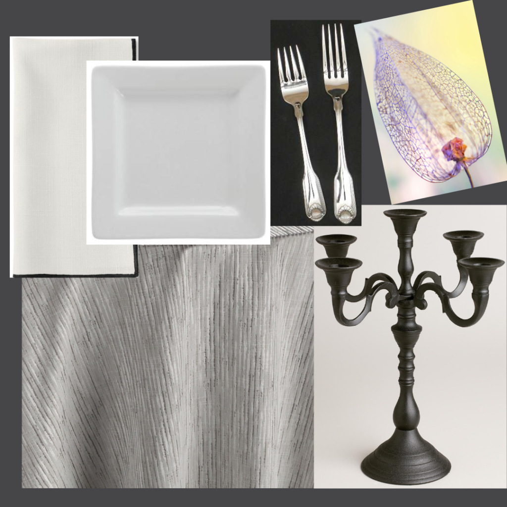 The final Halloween monster we have chosen to take inspiration from is the skeleton. We all have skeletons holding us up, so there is no one origin from which Halloween skeletons have sprung, but we can see skeletal imagery both in culture (like in the Mexican holiday Dia de los Muertos) and in the media (like the popular claymation film The Nightmare Before Christmas). For our skeleton inspired table, we chose a subtly woven ivory and white linen (BBJ Alder) that reminds us of bones and marrow. We chose to keep it simple with the accents, opting for a black and white color scheme and clean lines with a black-trimmed white napkin (BBJ Boca Black Trim), white square dinner plate, black candelabra, and silver shell flatware. You could get really creative with floral accents for this table, but we decided to highlight the Japanese lantern plant with its skeletal seed pods. Another great choice would be the seed pods of a snapdragon, which resemble tiny skulls.