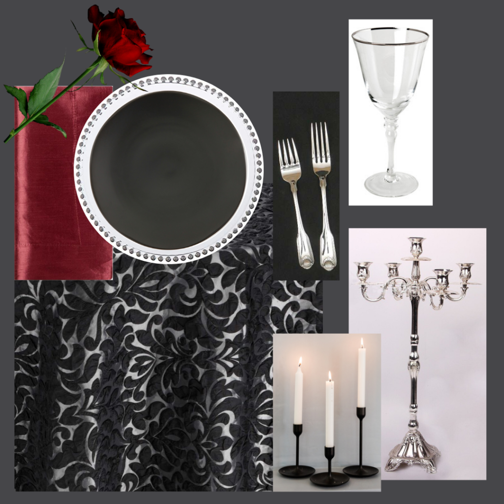 From Bram Stoker’s Dracula to Stephanie Meyer’s Twilight, this undead, immortal, bloodsucking monster has been the subject of literary legend for centuries. Rooted deeply in gothic literature and aesthetic, the vampire is often depicted in Victorian garb with dark, heavy, saturated hues. For this vampire inspired look we chose a dark silver linen with black velvet floral motifs (BBJ Amara Noir). We paired this with a silver-beaded charger under our new charcoal dinner plate, along with our silver shell flatware and beautiful silver-rimmed red wine glass. A glossy blood-red napkin (BBJ Shimmer Red) adds a subtle nod to the vampire’s beverage of choice. Sticking to the gothic theme, we also chose to accentuate the table with an ornate silver candelabra and black candlesticks, and leaving a single red rose on each plate will accent the red napkins and finish the look.