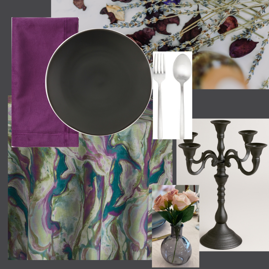 There are a few images that are synonymous with Halloween: pumpkins, black cats, and, of course, witches! Can you really have Halloween without witches? We say no! If the wild success of the 1993 movie Hocus Pocus is any indication, the image of a spooky spellcasting broom-rider on Halloween is the stuff of social intrigue. For this witchy look, we chose a gorgeous marbled linen that brings together all the colors that are commonly associated with Halloween witches (BBJ Opal). We chose to pair this with coordinating velvet napkin (BBJ Velvet Magenta), as well as black accents to tie in the color of a witch’s hat in the form of charcoal dinner plates, a black candelabra, and black stained glass bud vases. We chose a silver arezzo flatware set to finish the place setting and decided on a collection of dried herbs and flowers in place of a traditional floral bouquet.