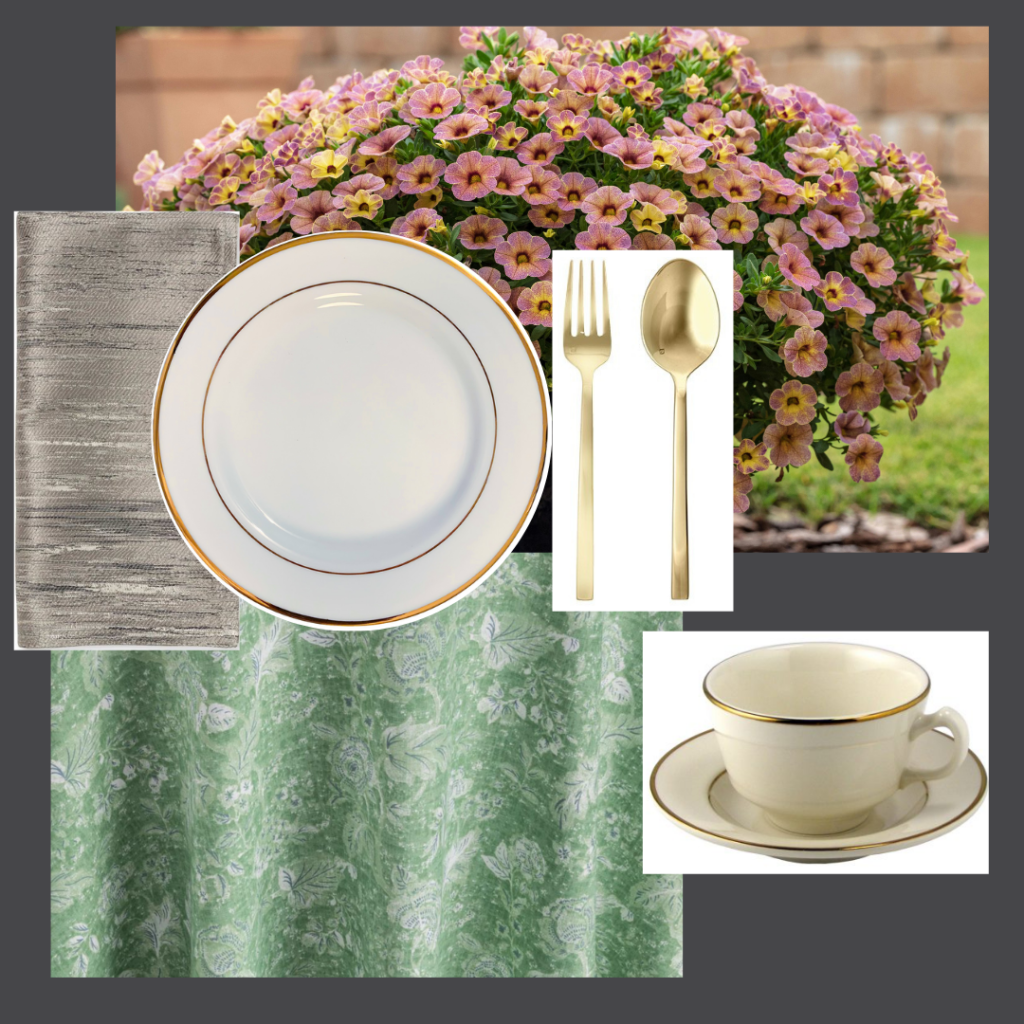 While we may know the zombie today by its depictions in modern TV shows and films like The Walking Dead and World War Z, the origins of the term “zombie” are attributed to 17th century West Africa, specifically Haiti, and are thought to be tied to the Vodou religion. Though literature around zombies have been around since that time, they gained popularity in the film scene in connection to popular Halloween haunts along the same time as Dracula and Frankenstein in the early to mid-20th century. For our zombie inspired look, we choose a green and ivory floral linen that resembles a zombie’s mottled skin (BBJ Meadow Laurel). We paired this with a textured ashen napkin (BBJ Moda Ash) along with ivory and gold accents in the form of arezzo gold flatware, gold band dinner plates, and a matching gold band cup and saucer. For florals, we chose a pink and yellow calibrachoa arrangement that is a subtle nod to a zombie’s search for brains.