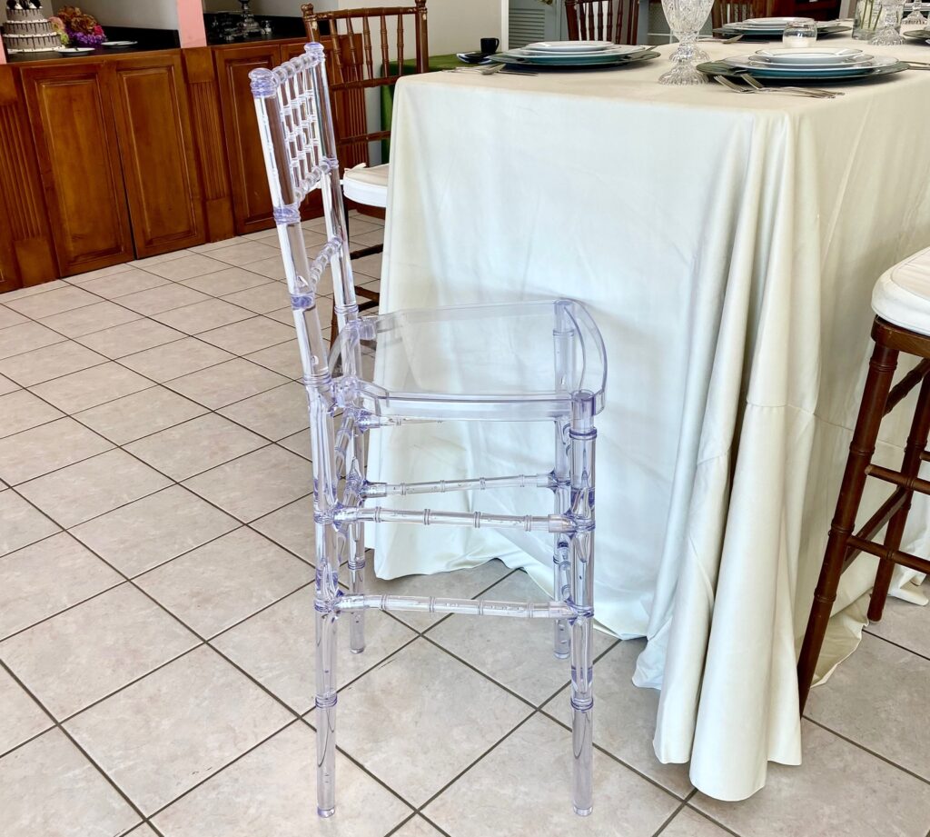 This year we added a third barstool to our lineup. These gorgeous clear crystal stools match our much-loved crystal chiavari banquet chairs, so now you can seat guests at both banquet height and high-top tables while still maintaining a theme with matching chairs throughout.