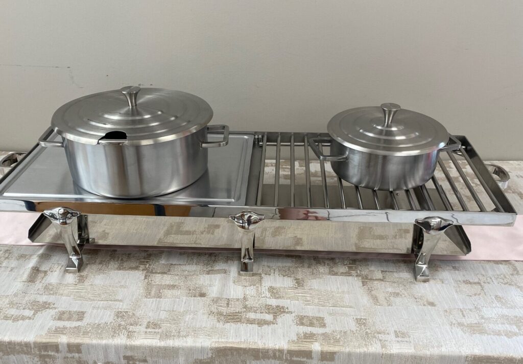 We carry all the standard food service and buffet line supplies, from chafing dishes and trays to serving utensils and cambros. This year we added a more modern, unique serving item in the form of this sleek stainless steel buffet stand. Featuring both a flat top and grated surface as well as ample space for heat-keeping elements like sterno candles, this buffet stand is a great option for displaying small sauce pots and collections of single-serve items.