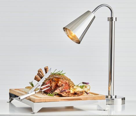 We already have two elegant single-unit heat lamp/carving station styles available, but this year we added a third style that features a chrome and wooden carving station and separate chrome heat lamp. This style adds an extra layer of customizability to your buffet table, allowing you to fit the station into a smaller space and vary the distance between the carving station and heat lamp to achieve the perfect temperature.