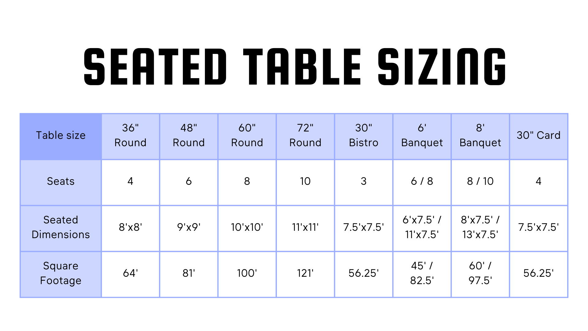 Laying out the general floorplan of your event is not only useful for visualizing your event, but it is also essential for understanding how much space you have available and deciding which items will efficiently fill the space. The first step is measuring your venue to see how much space you have, and the second is knowing how much space your items take up. While some stationary things like dance floors and stages are easy to measure and place, it can be difficult to know how much space you need to allocate toward the hustle and bustle of guests sitting at and moving around banquet tables. How much space do guests need to pull out chairs to sit in? How much room do guests need to walk behind and between occupied chairs? The general formula we like to follow is the table dimension + 2.5 feet on each seated side. What does that look like for each table size? Let’s break it down! And while we’re at it, let’s look at how many people can sit at each table and what size cloth you need to cover it.