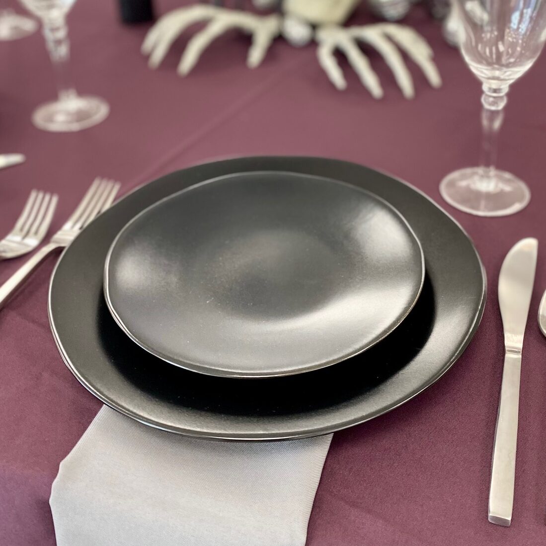 Paper plates work great for a casual holiday meetup, but for a more intentional, luxurious feel, real china is the way to go. Our matte black Heirloom charcoal china fits perfectly with a spooky aesthetic, and you can layer them with a simple white charger to make them really pop against your table and linens. The charcoal china set even includes a sleek mug to hold all your cozy fall beverages.