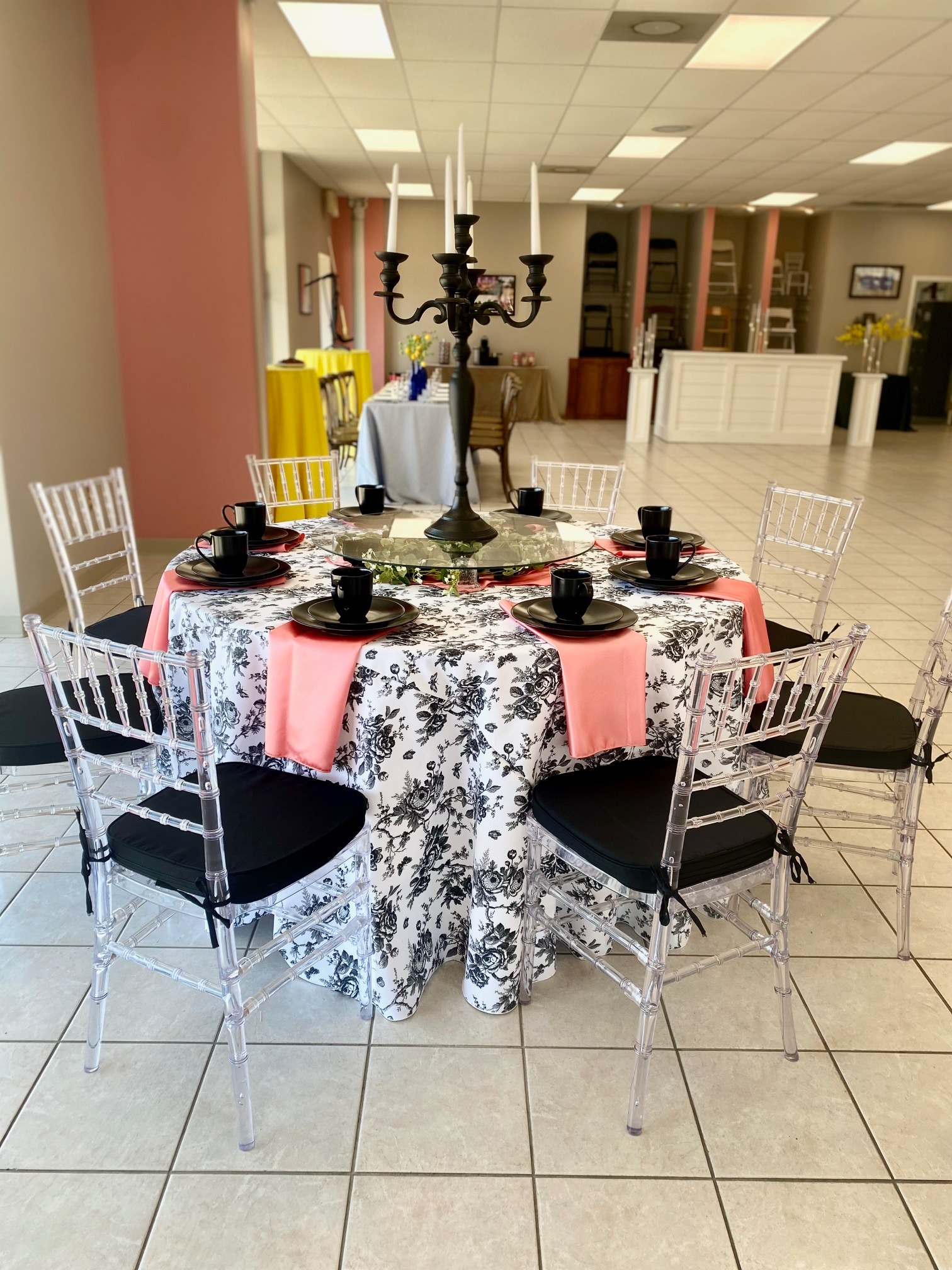 This look went up in the show room in April with the goal of showcasing our new party toile tablecloths, and it ended up being an unintentional showstopper. This 60 inch round table was draped in our black party toile cloth, and we honed in on the black theme by bringing in our heirloom charcoal china sets, complete with dinner plate, salad plate, and mug. We chose a coral satin napkin to bring in a pop of color, then we focused on the center of the table. We used one of our favorite techniques to create a unique centerpiece, using a glass table topper set on overturned votives to create a platform for our onyx tableabra. Since the platform is fully transparent, it allowed a clear view to the bed of flowers we placed underneath it. To create balance with the transparent tabletop elements, we chose our clear chiavari chairs for seating and topped them with black cushions for comfort. The contrast between light and dark in this tablescape made it truly striking to look at.
