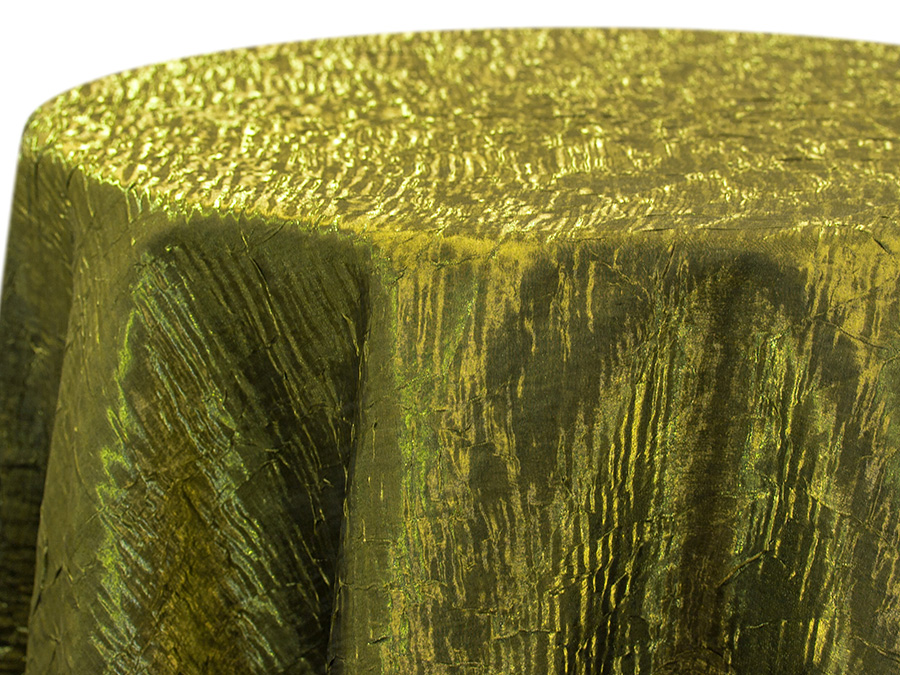 Iridescent Crush is a lightweight linen made by weaving shiny fibers over the top of matte fibers. This, combined with the crushed texture of the linen, creates a unique iridescent effect that catches the light and shifts it around with movement. Iridescent Crush is available in multiple sizes of round and rectangular tablecloths, as well as toppers, runners, and sashes. Pricing is subject to availability.