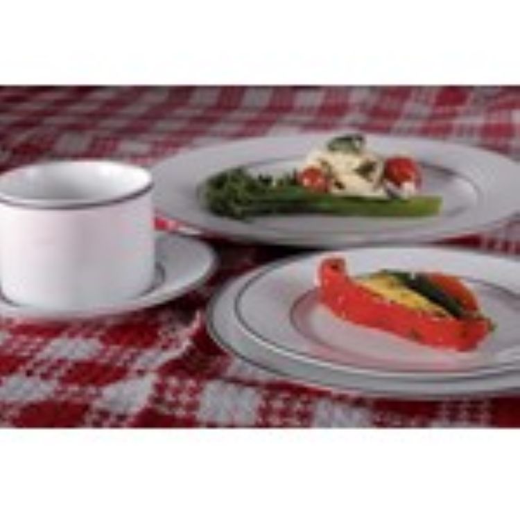 Rented individually or as a 5-peice setting, this pattern offers a dinner plate, salad plate, bread/dessert plate, cup, saucer, and rimmed soup bowl. The satin silver banding pairs well with any satin or matte finish stainless flatware. Add one of our glass chargers for an amazing and elegant look!
