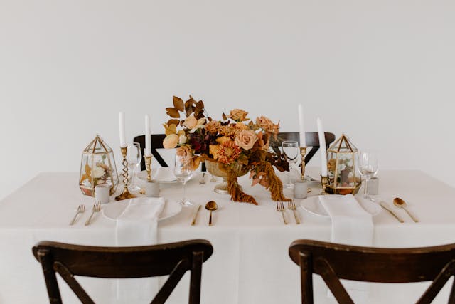 Candles will never lose their place in the wedding scene, but the form they appear in is constantly changing. Brides this year are leaving votives behind in the summer season and entering the fall with a love for taper candles. Sculptural taper candles, with their fun twists, curves, shapes, and stripes, are enjoying their well-deserved time in the spotlight this season, along with colorful candles that match the overall palette. Don’t worry, regular white and ivory tapers are popular this fall too, especially when paired with elegant candlesticks and arranged in tasteful clusters of varying heights.