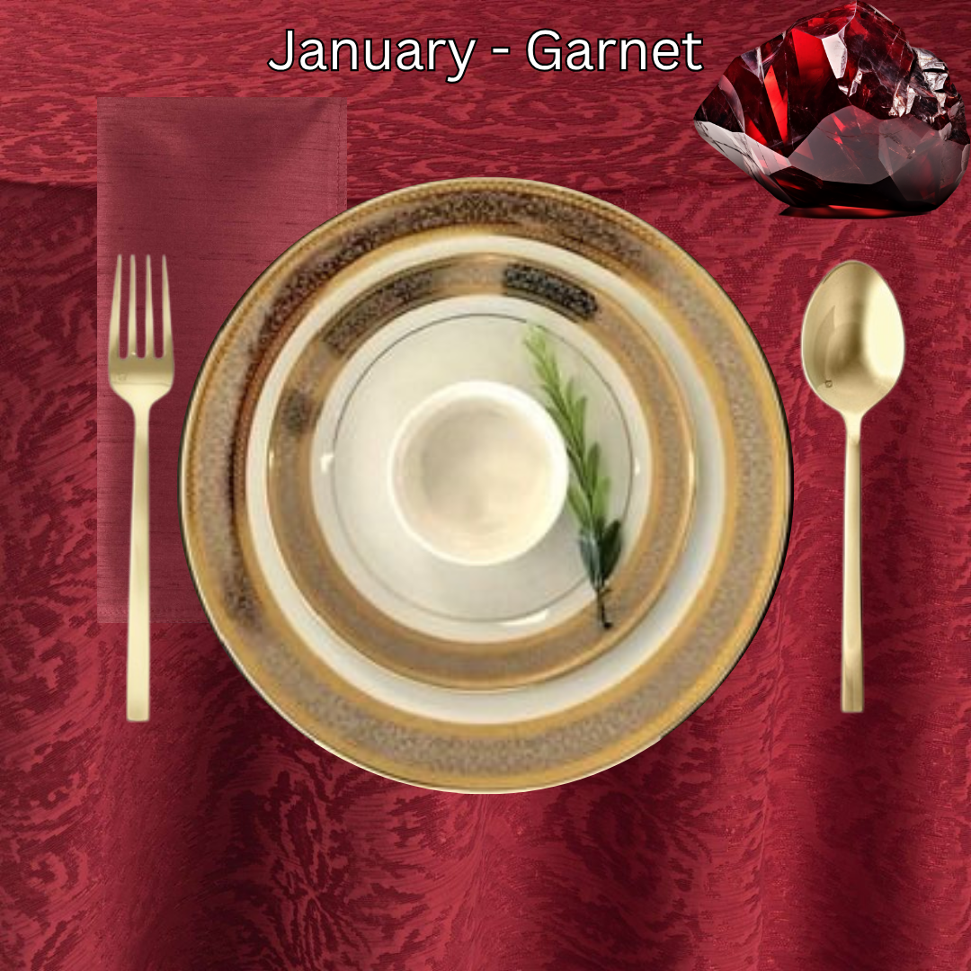 January’s birthstone is Garnet, a deep red gemstone with a close resemblance to pomegranate seeds. The rich, warm color of this stone is perfect for the frigid new year season. There are many deep red linens that could capture the essence of a garnet, but we chose BBJ’s Celeste Red. This gorgeous cloth has a subtle two-toned damask pattern that mimics the light and dark facets of the gem, and its shimmering finish catches the light to beautifully highlight its heavy, luxurious drape. A Majestic Gold china set and Arezzo gold flatware complement the look, and a matching Shantung Merlo Napkin completes the setting.