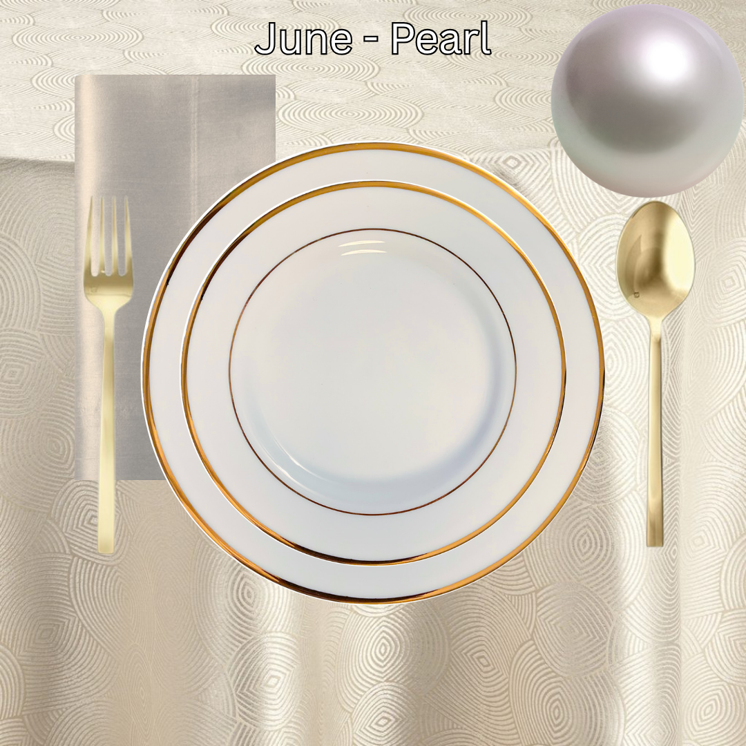 June’s birthstone is the lustrous Pearl. Though very different from other month’s stones, the pearl comes at the perfect time as the first month of summer pulls people to the beaches and shores. BBJ’s Lucca Alabaster, with its pearlescent pattern of ivory and sand, captures the unique color of a freshwater pearl. This is paired with an iridescent Dupionique Wafer napkin, and a classy Gold Banded Ivory china set and Arezzo gold flatware complete the look.